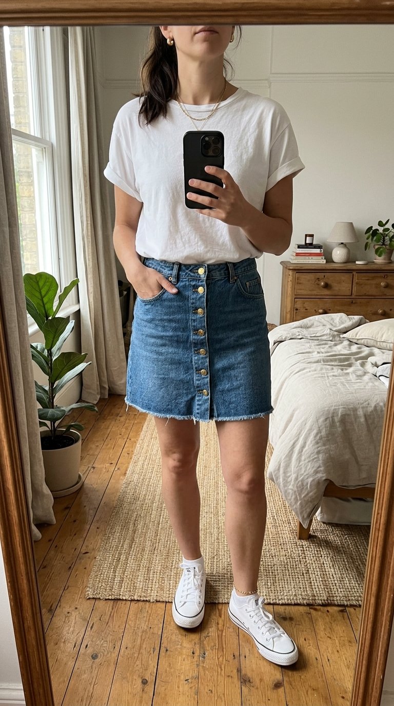 Here is a game-changing trick: leave the very bottom button of your skirt completely undone. This tiny styling detail creates a subtle slit that adds gorgeous movement when you walk and keeps the stiff denim from bunching up.