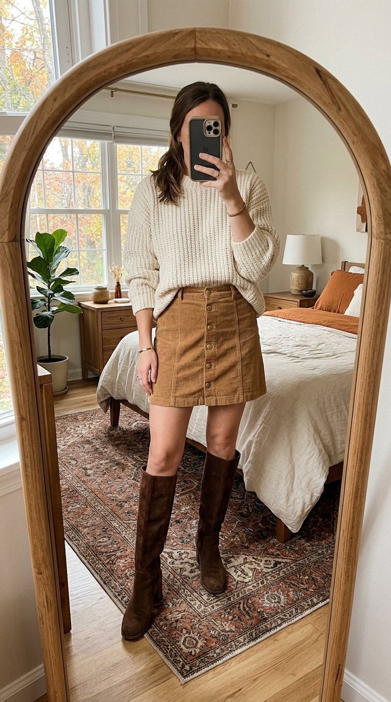 Your knee-high boots should meet the hem of the skirt perfectly, or leave just an inch or two of space. This creates a beautifully continuous line that keeps your legs looking miles long, even when bundled up.