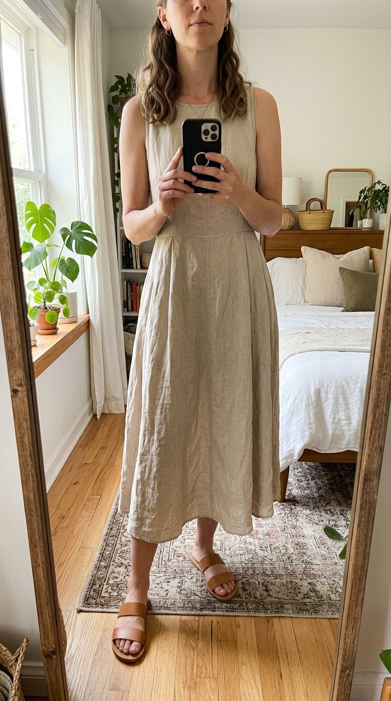 The key to making this outfit work is choosing a midi dress with a truly relaxed, voluminous fit. You want the fabric to float away from your skin, creating a beautiful breeze every time you walk. Look for a dress with a tiered skirt or a loose empire waist to maximize that airy feeling.