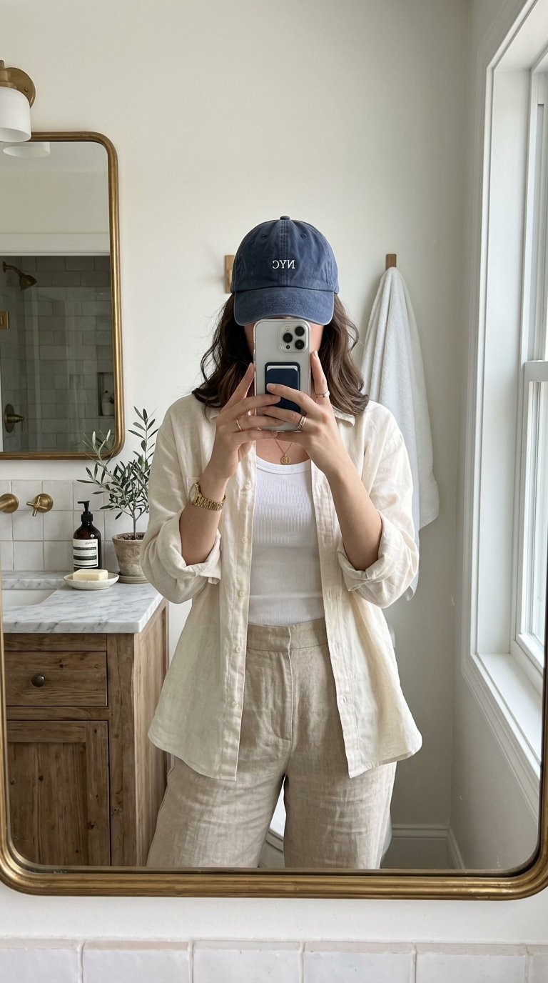 Linen is the undisputed MVP of summer fashion, but it can sometimes lean a little bit stuffy or overly mature. Introducing a baseball cap to a tailored linen ensemble completely flips the script. It injects a youthful, relaxed energy into the outfit while maintaining that luxurious, wealthy aesthetic.