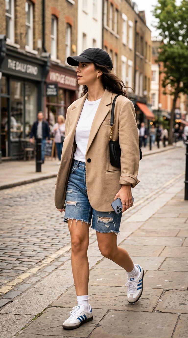 This outfit plays with the concept of high-low dressing, blending polished office wear with relaxed weekend staples. The blazer elevates the shorts, while the cap and sneakers keep the blazer from feeling too corporate. It is a masterclass in outfit balancing that anyone can pull off.