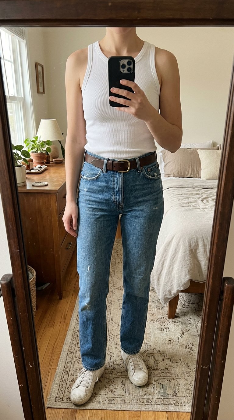Always tuck your ribbed tank completely into your jeans to highlight your waistline and create a clean, seamless silhouette.