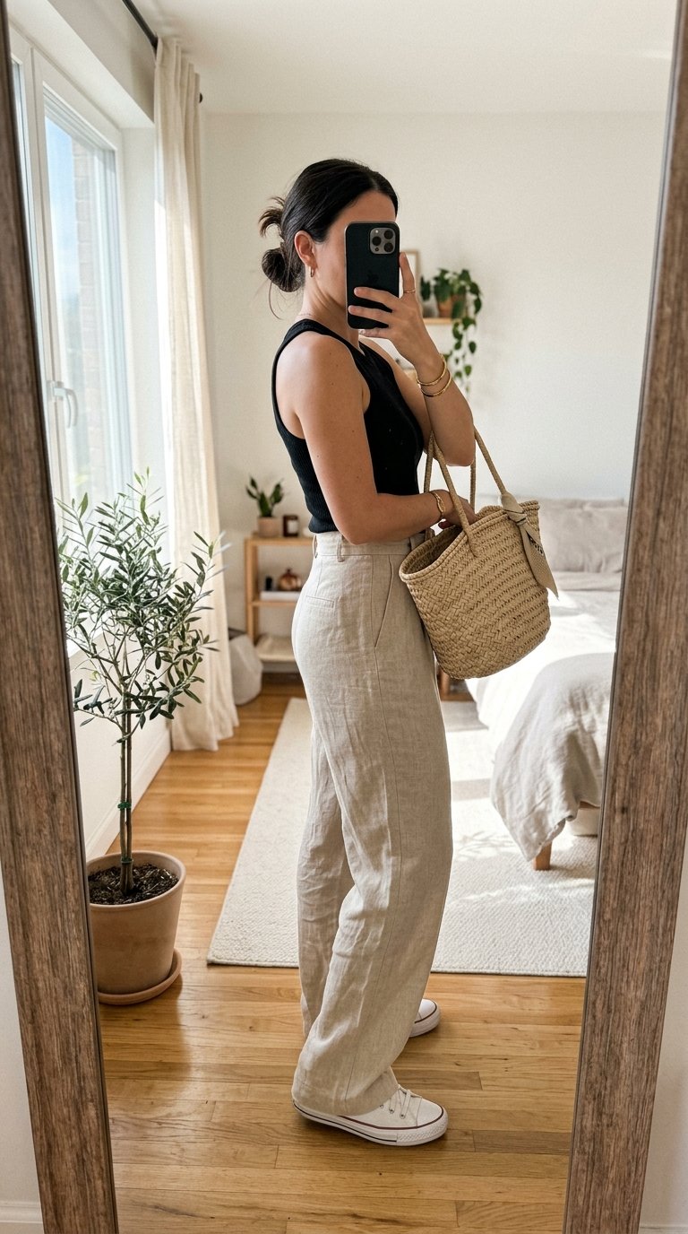 When working with wide-leg linen pants, a fitted top is absolutely non-negotiable.