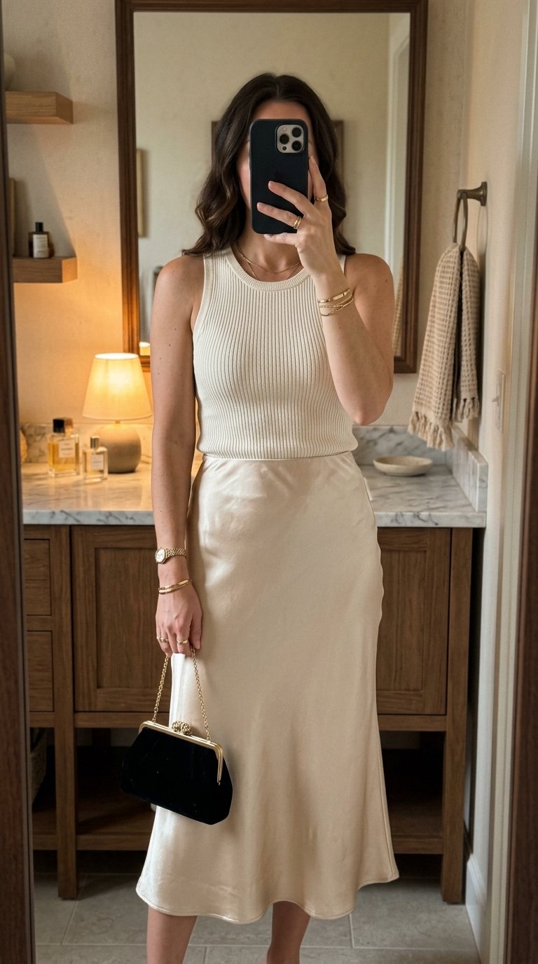 Pairing a casual ribbed top with a luxurious silk midi skirt is the ultimate high-low fashion hack.
