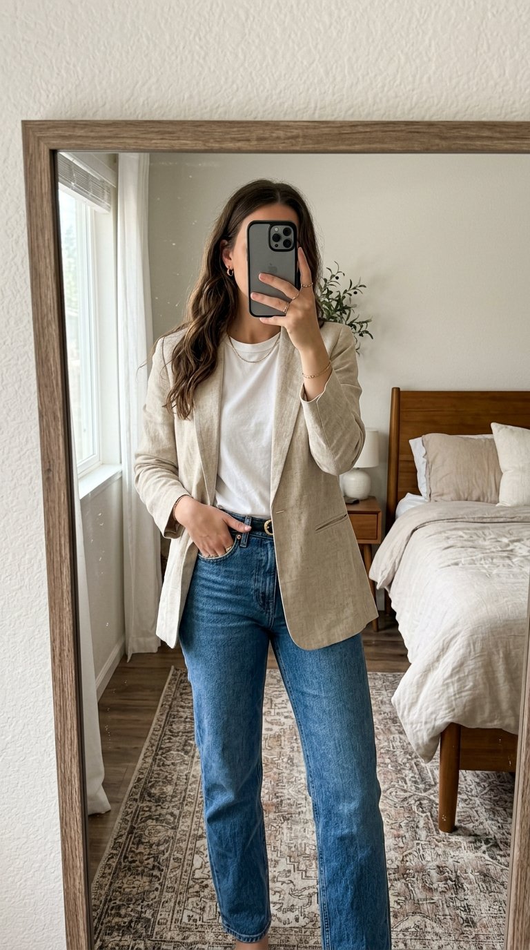 The magic here lies in the contrast between crisp, tailored linen and perfectly lived-in denim. It creates that coveted “model off-duty” aesthetic that works for almost everyone. Plus, it is incredibly forgiving and comfortable for all-day wear.