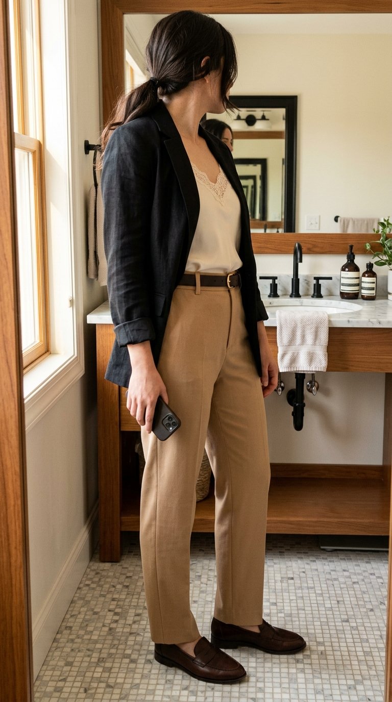 The key to making linen work for the office is choosing pieces with excellent tailoring. Your olive green tailored linen blazer should fit perfectly across the shoulders, even if the body is slightly relaxed. The structured shoulders provide that necessary corporate polish.