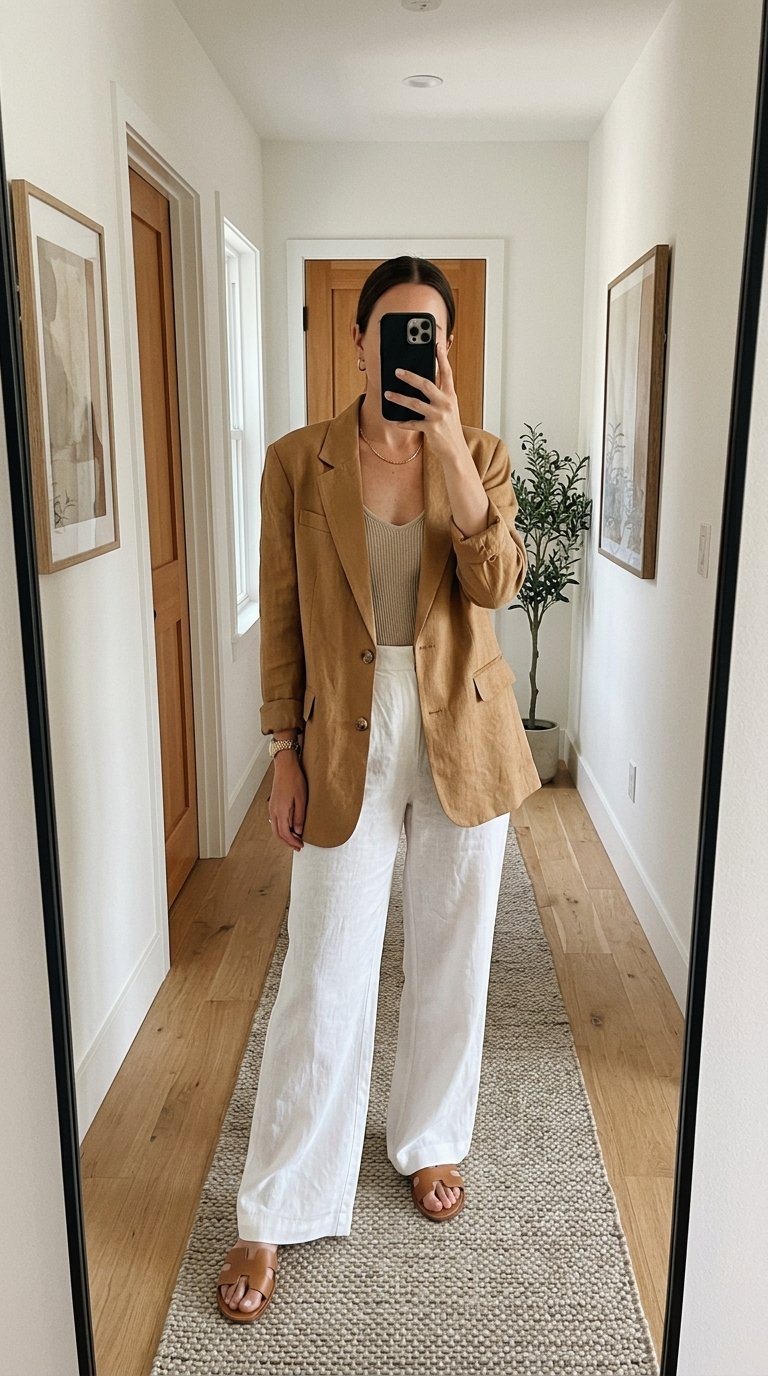 This outfit plays heavily on classic nautical themes without looking like a costume. The crisp navy blue linen blazer acts as the perfect anchor for the breezy flowing white wide-leg linen pants. Make sure your blazer hits right at your hip bone to maintain proper proportions with the wide pants.