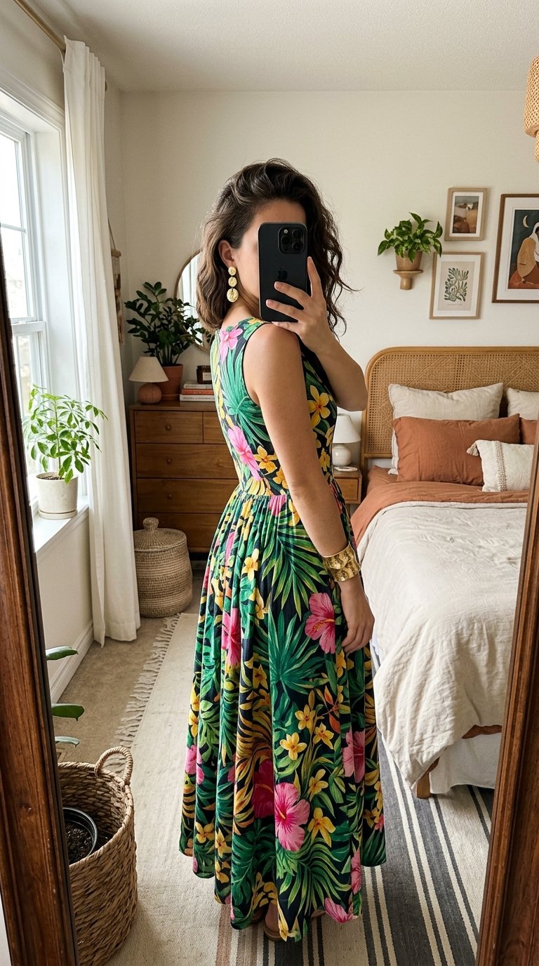 4. The Bold Tropical Maxi Outfit That Balances Prints With Perfect Gold Accents