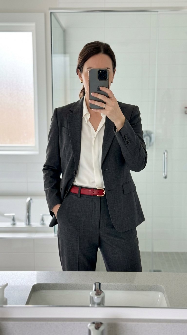 Let your footwear be the sole star of the show by keeping the rest of the outfit strictly neutral. Those cherry red kitten heels peeking out from under the hem of your grey trousers provide the ultimate unexpected red moment. It is highly professional but still packs a serious punch.