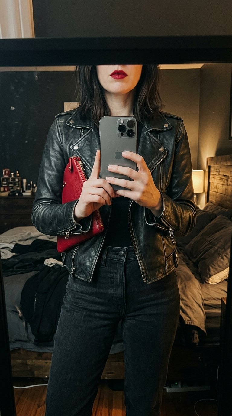 4. The Edgy Moto Leather Ensemble With A Cherry Red Lip And Clutch