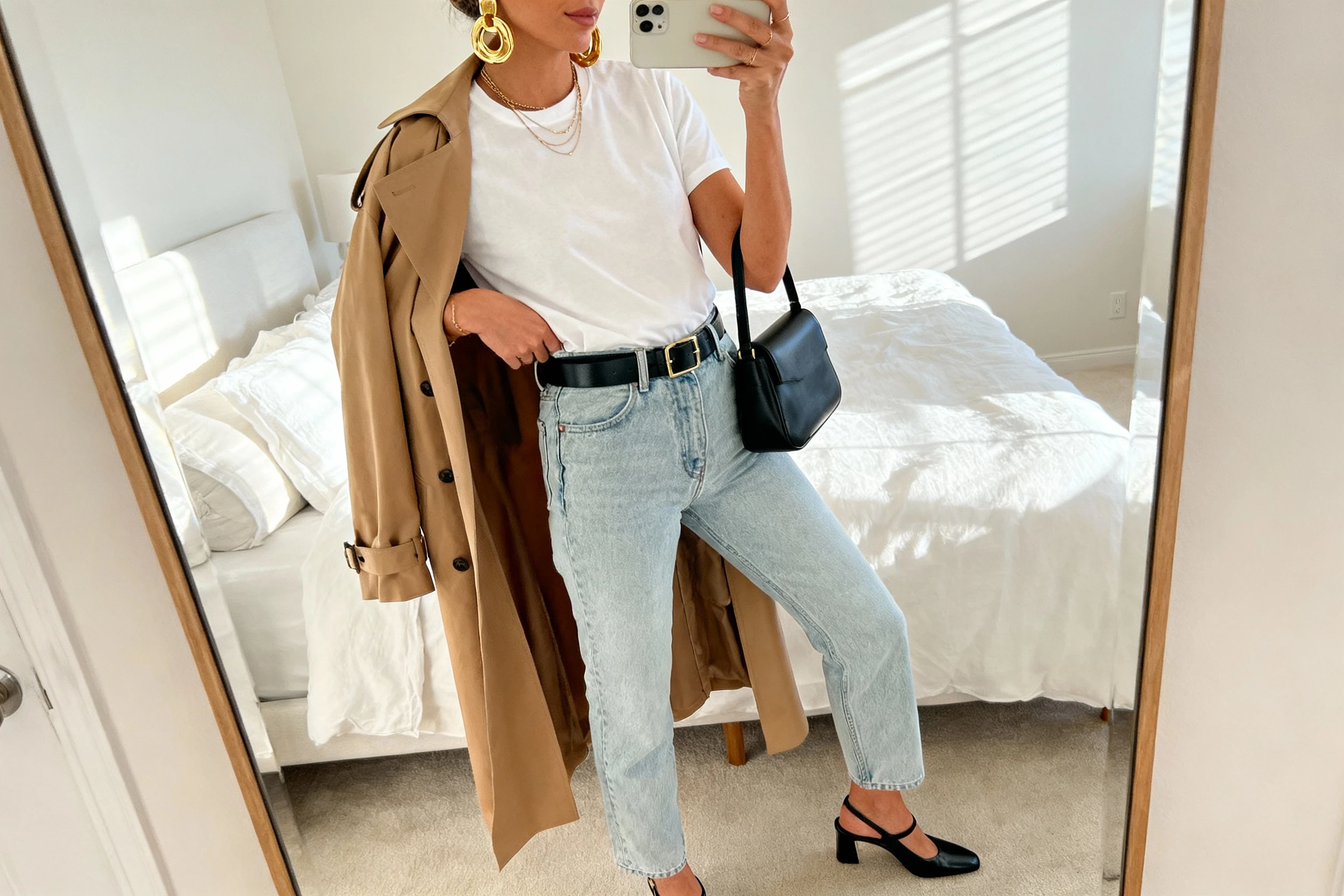 This is the uniform we keep coming back to: a crisp tee, great denim, and earrings that look like art. Sculptural gold drops turn “casual” into “editor off-duty” without trying too hard. It’s minimal, polished, and ridiculously wearable.