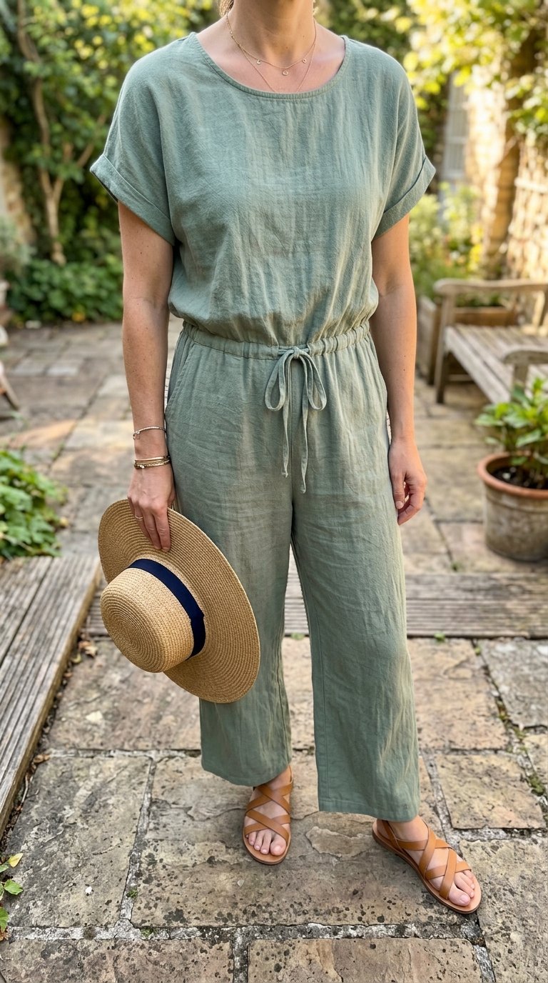 • Olive green linen-blend jumpsuit with a flattering cropped wide leg