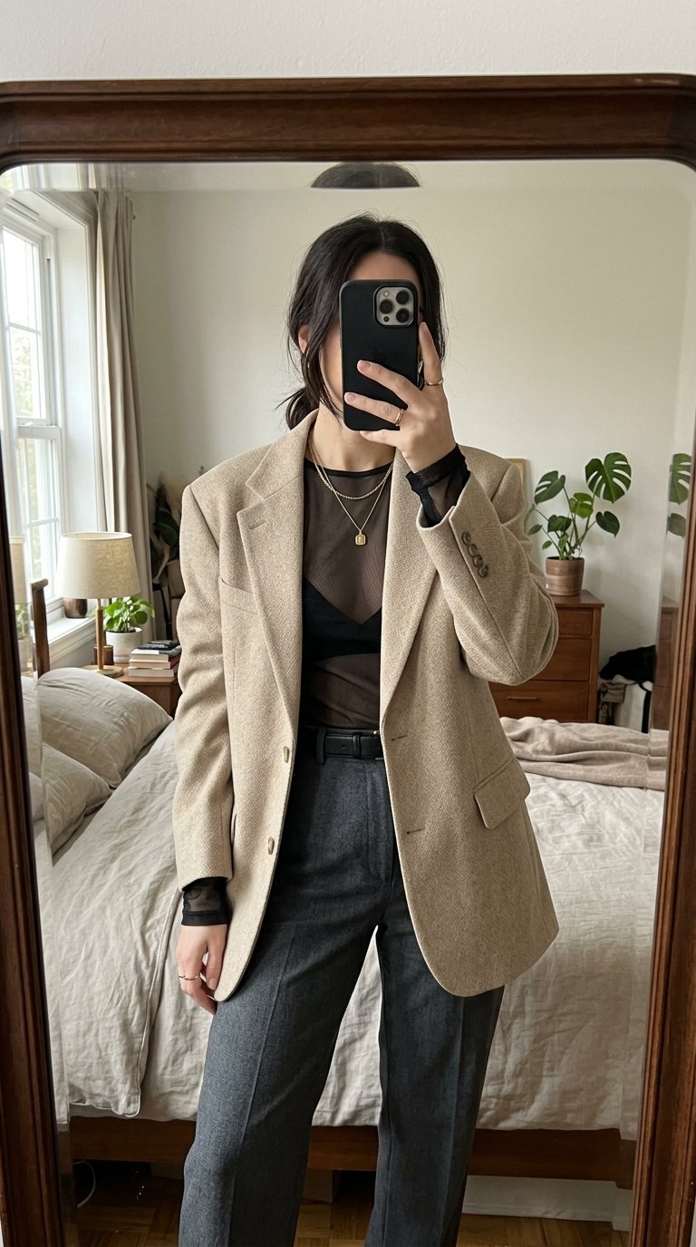 Have you ever stared at a sheer top and wondered how to wear it to an actual dinner without feeling completely on display? This blazer combination is your ultimate styling savior.