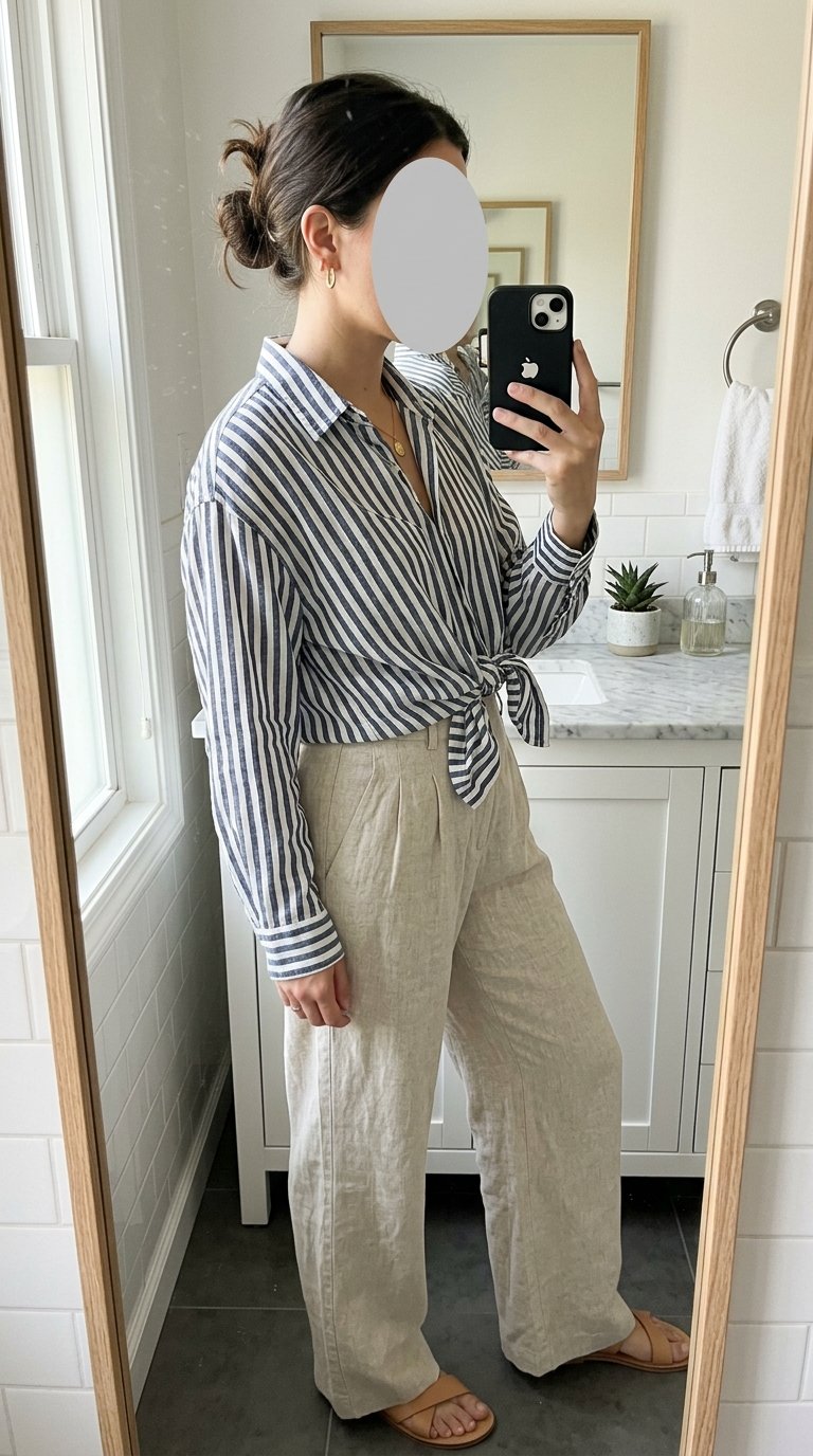 You can adjust the tightness of the knot to control exactly how cropped the shirt becomes. If you want to show a sliver of your swimsuit, tie it a bit higher up. For a more conservative look, tie the knot lower down so it meets the waistband of your high-waisted linen shorts perfectly.