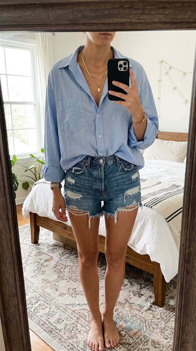 - A lightweight chambray or pastel oversized button-down