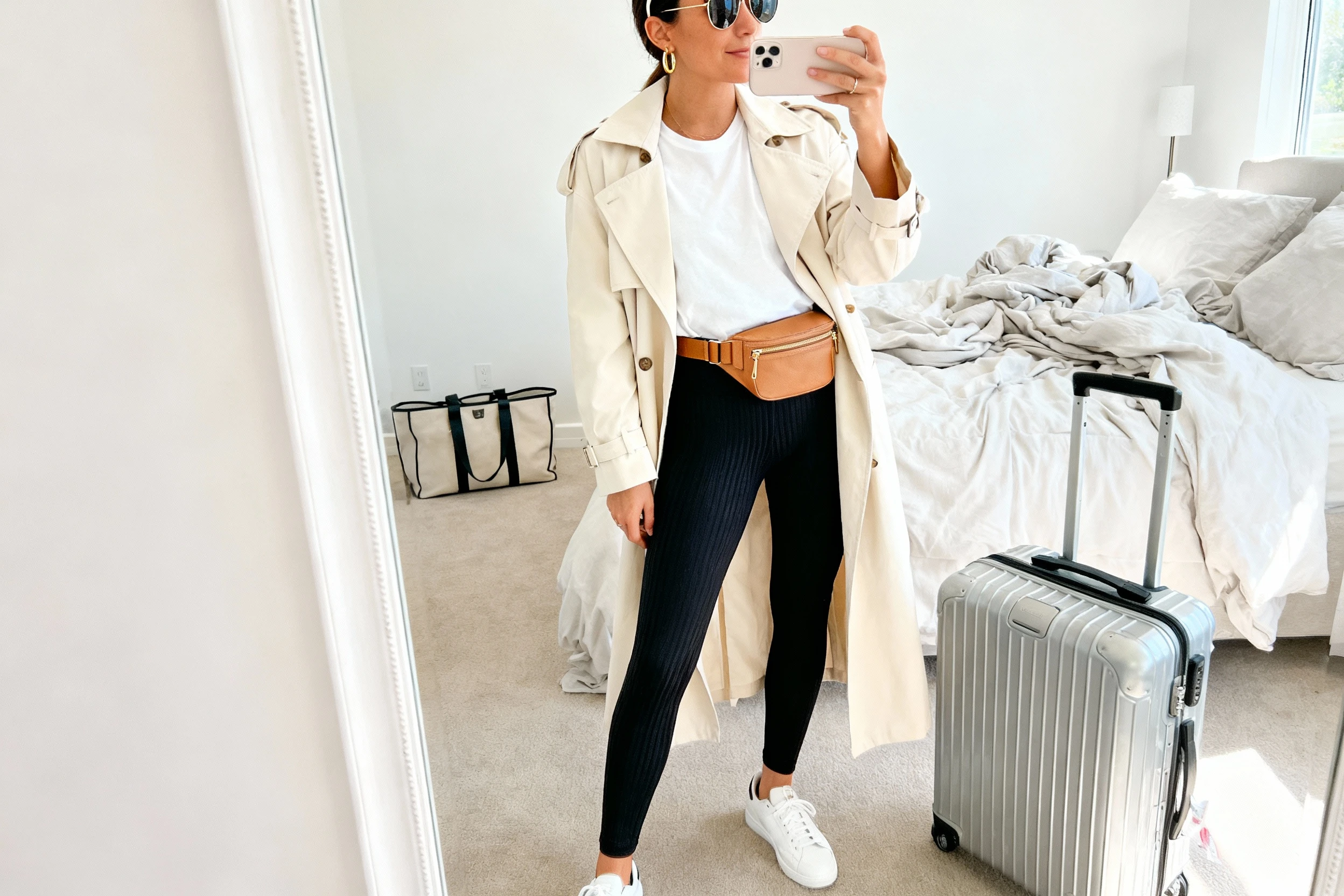 Perfect for trips where you’re landing and heading straight to plans. You can swap the trench for a cropped denim jacket in warmer weather or add opaque tights and ankle boots if it’s chilly. A belt bag over the trench also adds shape and keeps essentials close.