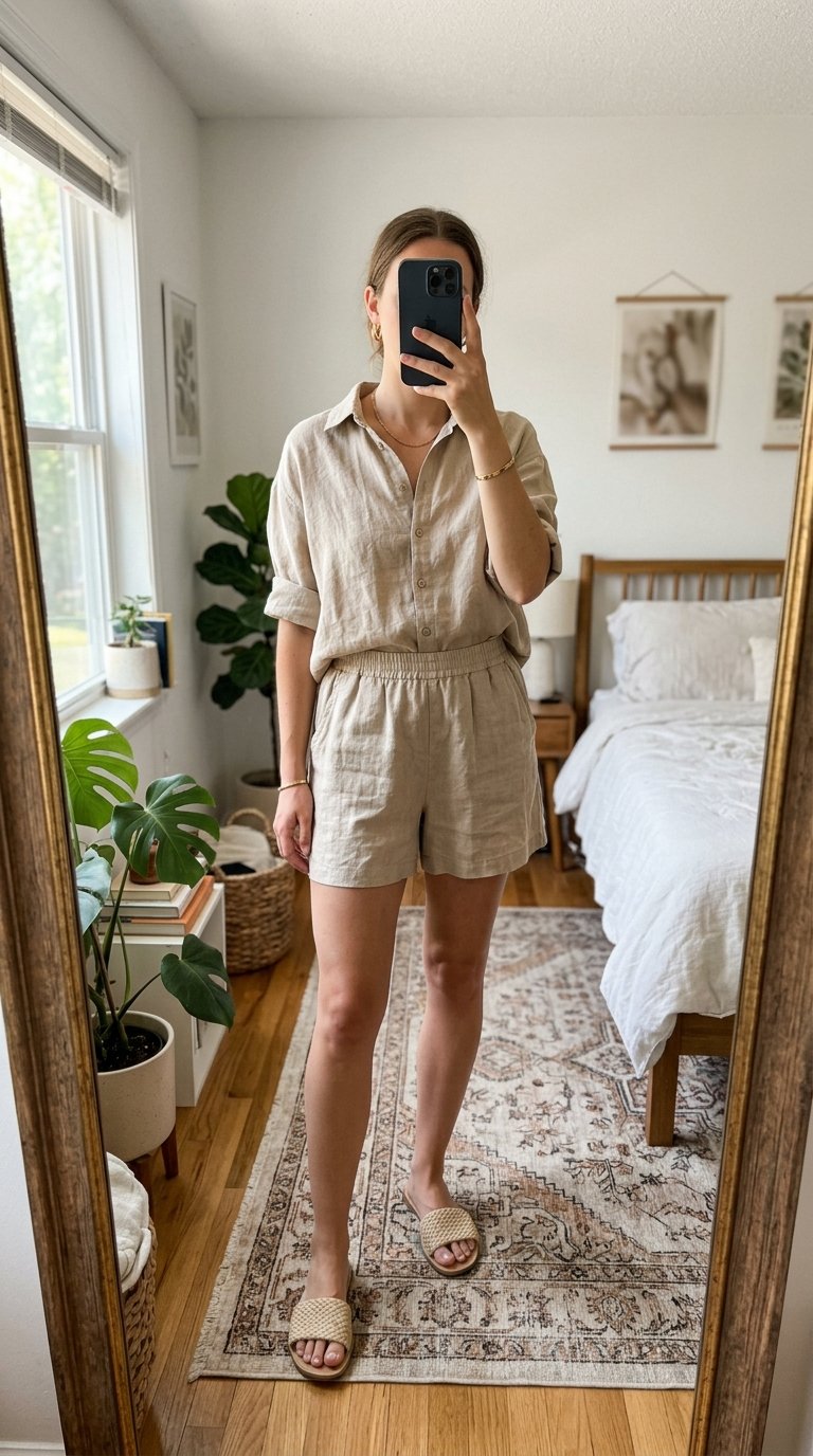 - Matching high-waisted linen shorts with a comfortable drawstring waist