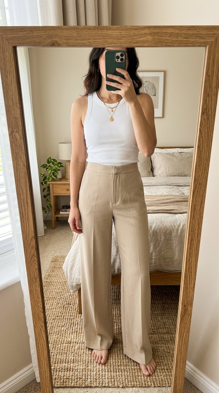Balance is the golden rule for this outfit. Because your trousers are wide and flowing, your top needs to be fitted to your body. A ribbed knit tank top is perfect because it hugs your curves and provides a clean, sleek contrast to the volume on the bottom.