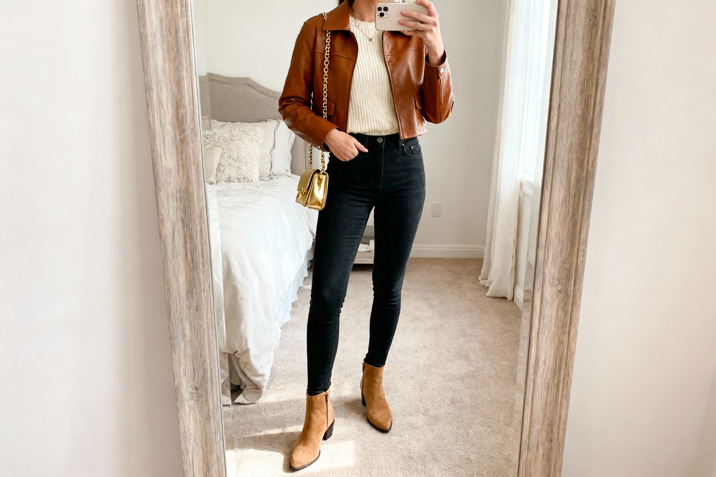 I put together five looks that hit different moods but all orbit around that gorgeous brown leather. Think cozy textures, flirty silhouettes, and just enough edge to keep things interesting. Ready to get dressed in five minutes and still look like a rom-com lead? Let’s go.