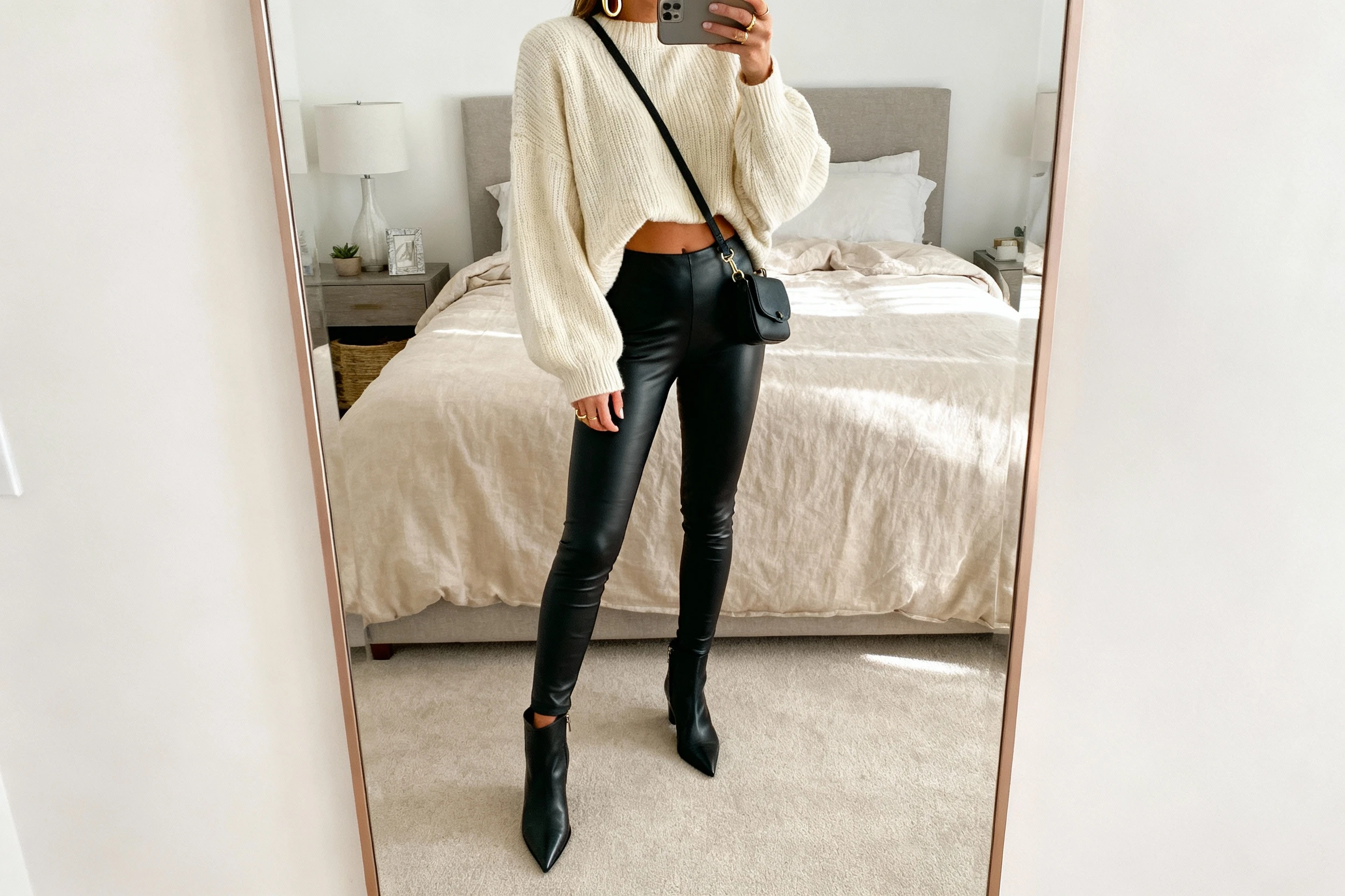 - Faux leather leggings (high-waisted, contouring)