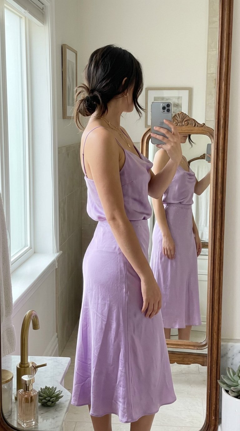 • Matching lavender bias-cut midi skirt that hits perfectly right at the mid-calf