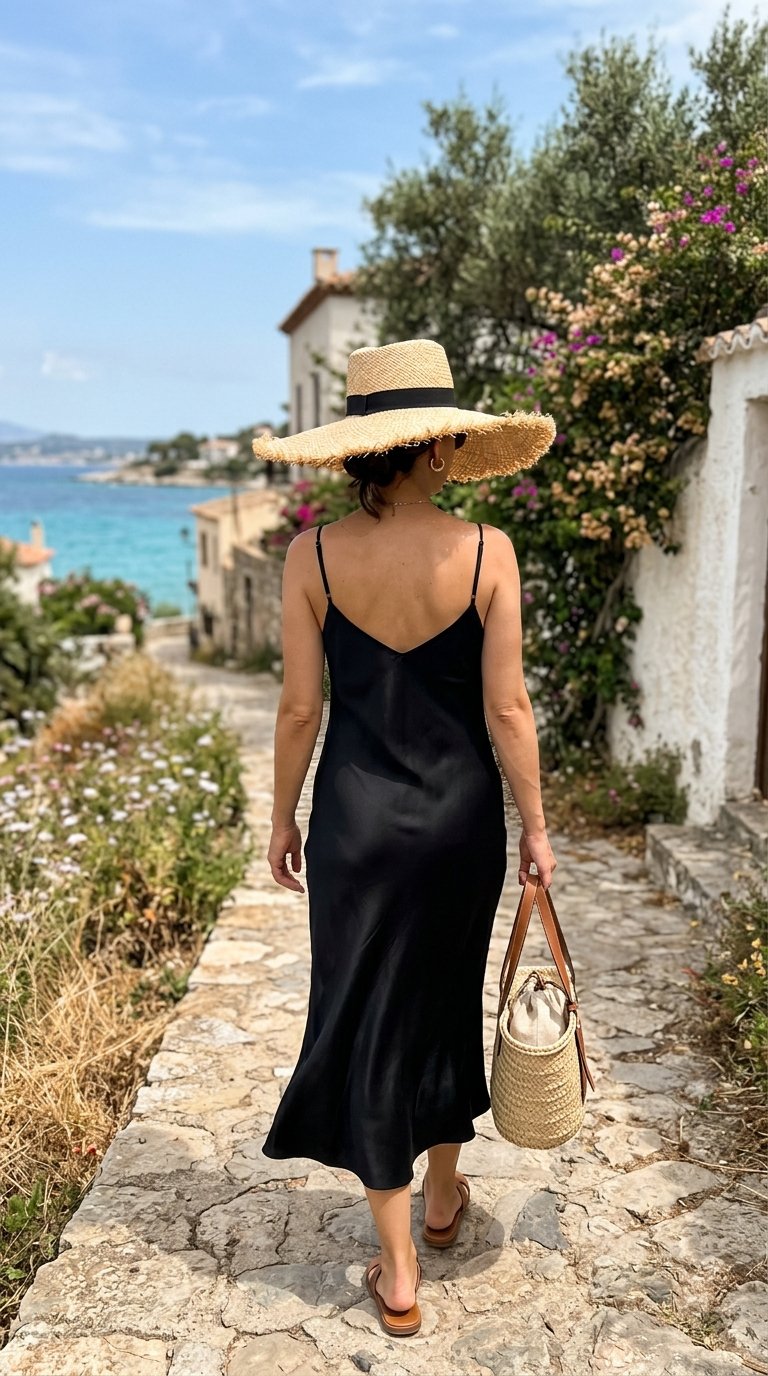 Because the dress itself is so sleek and understated, you can afford to go huge and dramatic with your accessories. The massive, wavy brim of your oversized floppy sun hat adds a beautiful sense of movement and romance. It creates a stunning silhouette that balances the minimalist lines of your slip dress perfectly.