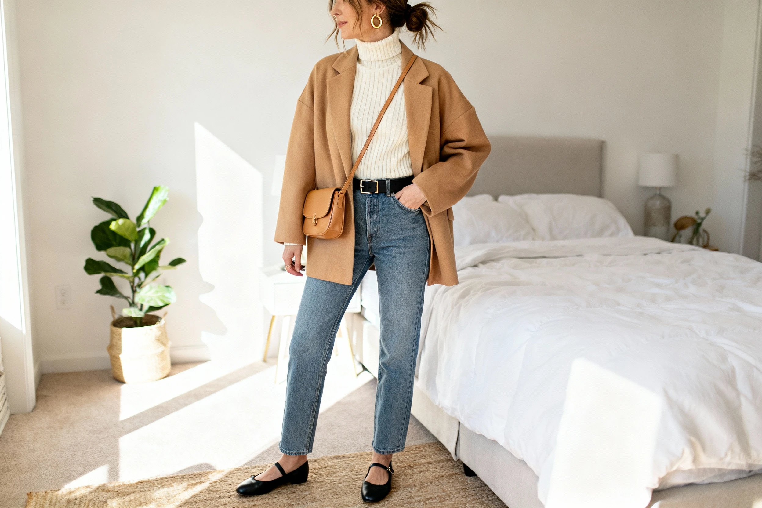 iPhone mirror selfie of a woman wearing a tailored blazer over a crisp white tee, straight-leg dark jeans, sleek belt, pointed-toe loafers, minimal gold hoops, structured top-handle bag, face not visible, cropped at neck, bedroom mirror, morning window light, iPhone photo quality.