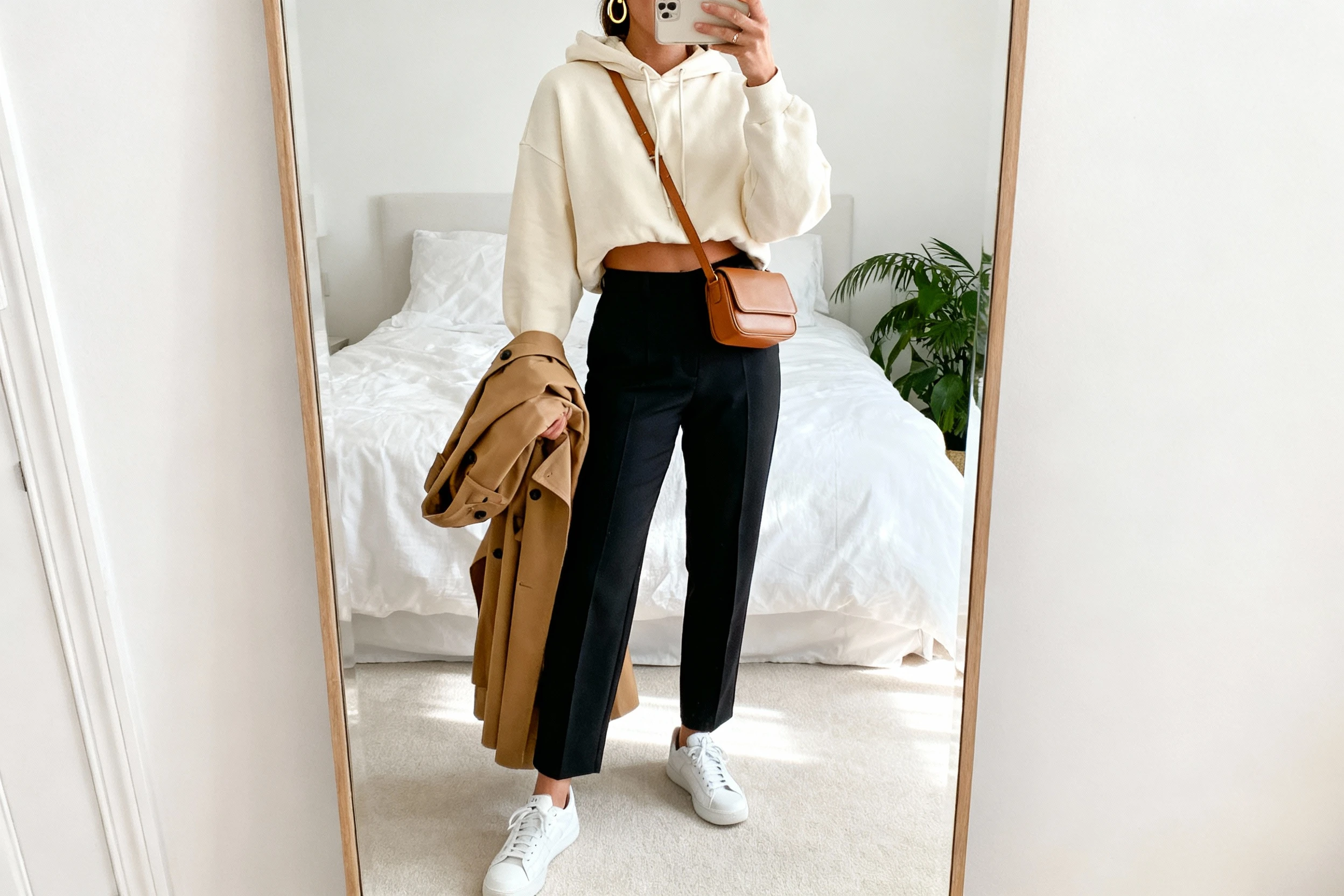 - Tie the trench belt loosely at the back for a clean, open silhouette that frames the hoodie.