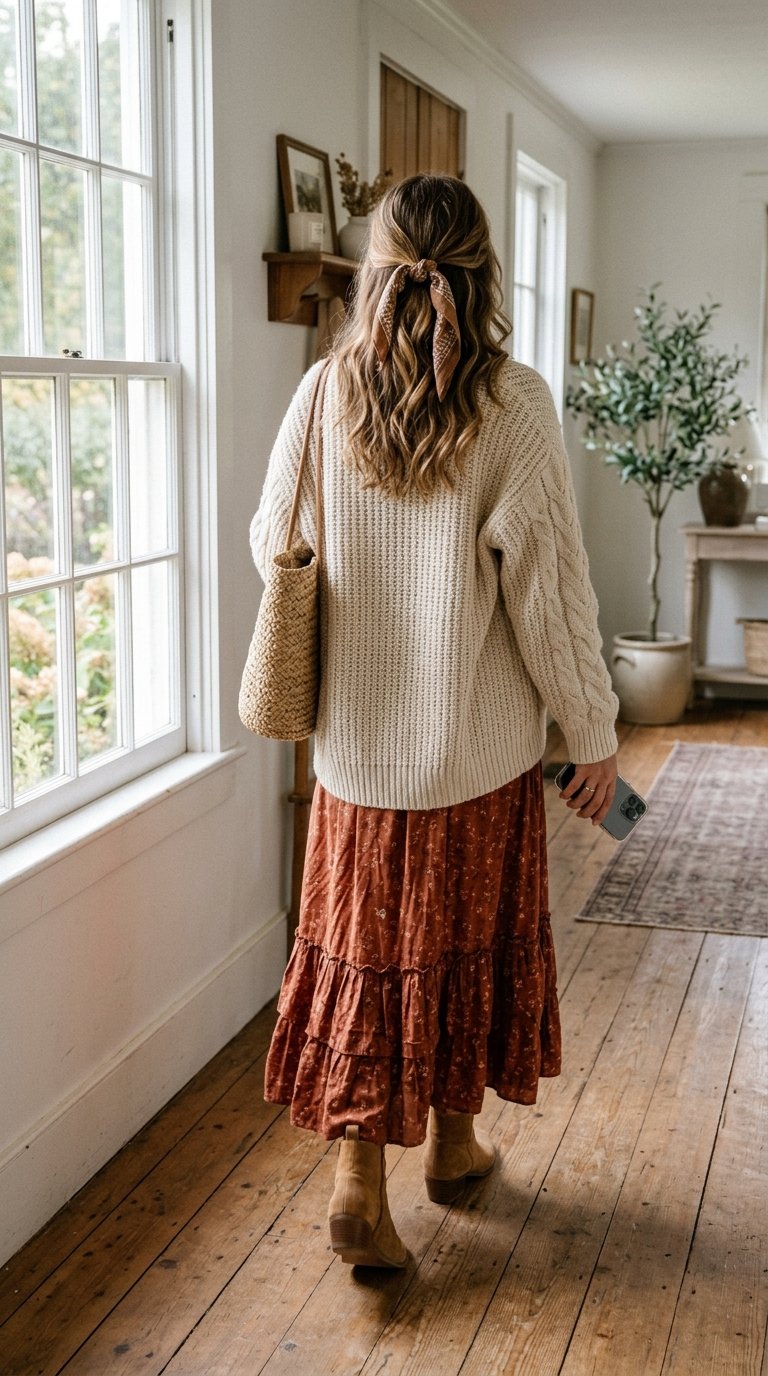 Footwear is crucial for mastering this transitional look. Tan suede knee-high boots worn underneath a long skirt create a seamless, elongated line that looks incredibly chic and keeps your legs warm.