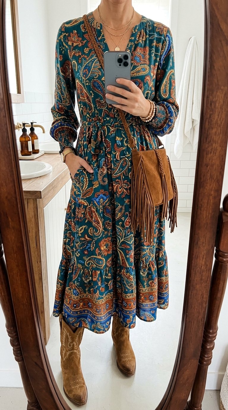 Layering is your absolute best friend here, so start with a dress in a rich, autumnal hue like rust, burgundy, or golden yellow. Long sleeves add essential warmth and create a beautiful vintage-inspired silhouette.