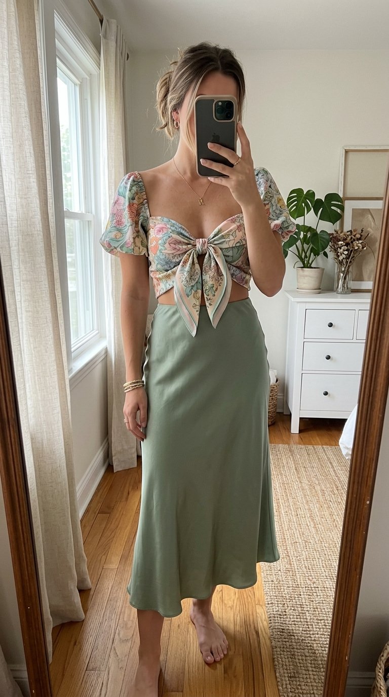 If your personal style leans more toward the feminine and flirty side, the front-tie sweetheart bow is going to be your new obsession. This method creates the illusion of a structured bustier top, complete with a prominent, playful bow right at the center of your chest.