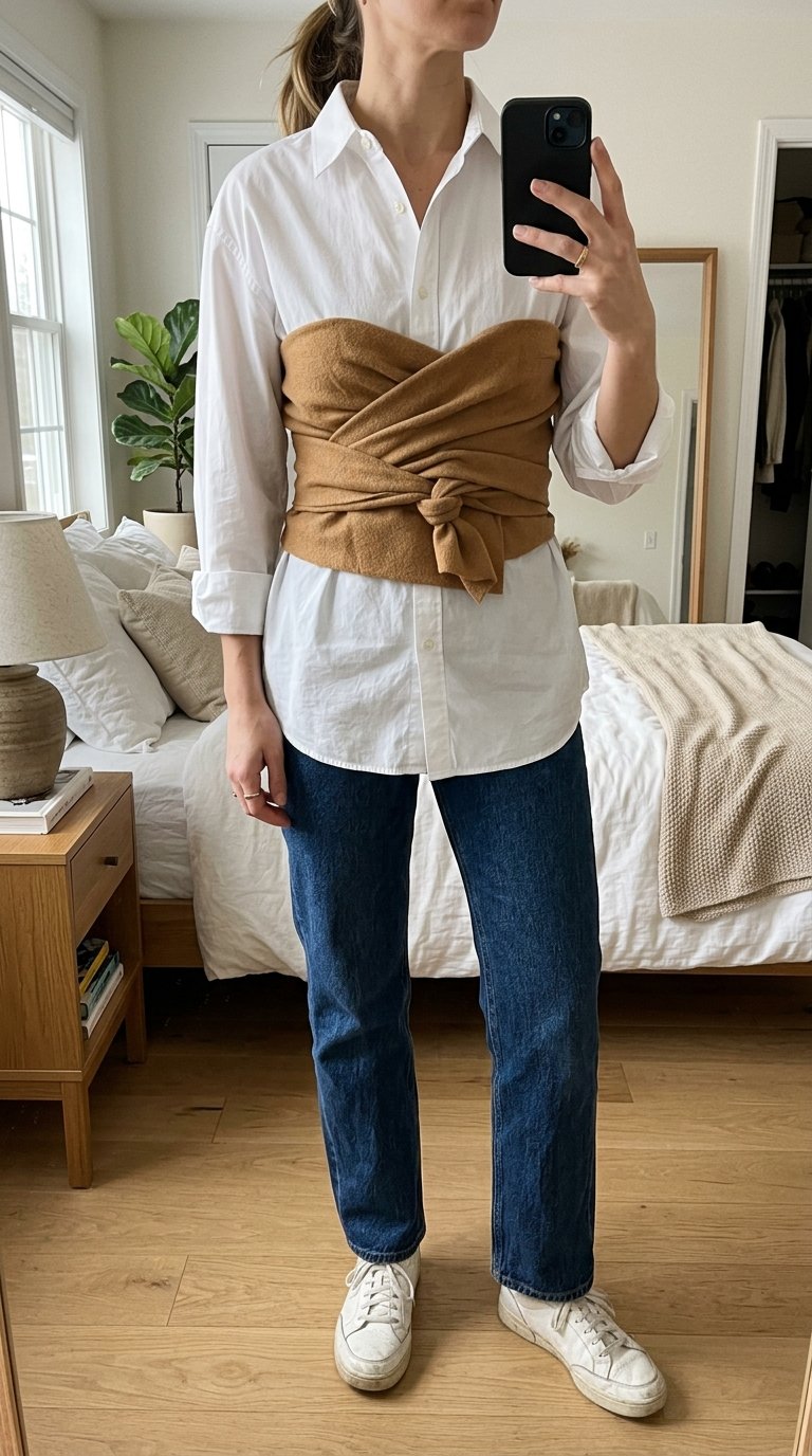 This method acts like a waist-cinching vest or corset, adding visual interest and breaking up the monotony of a standard button-down. It is the perfect way to play with patterns and textures while remaining completely comfortable and appropriately covered for cooler weather.