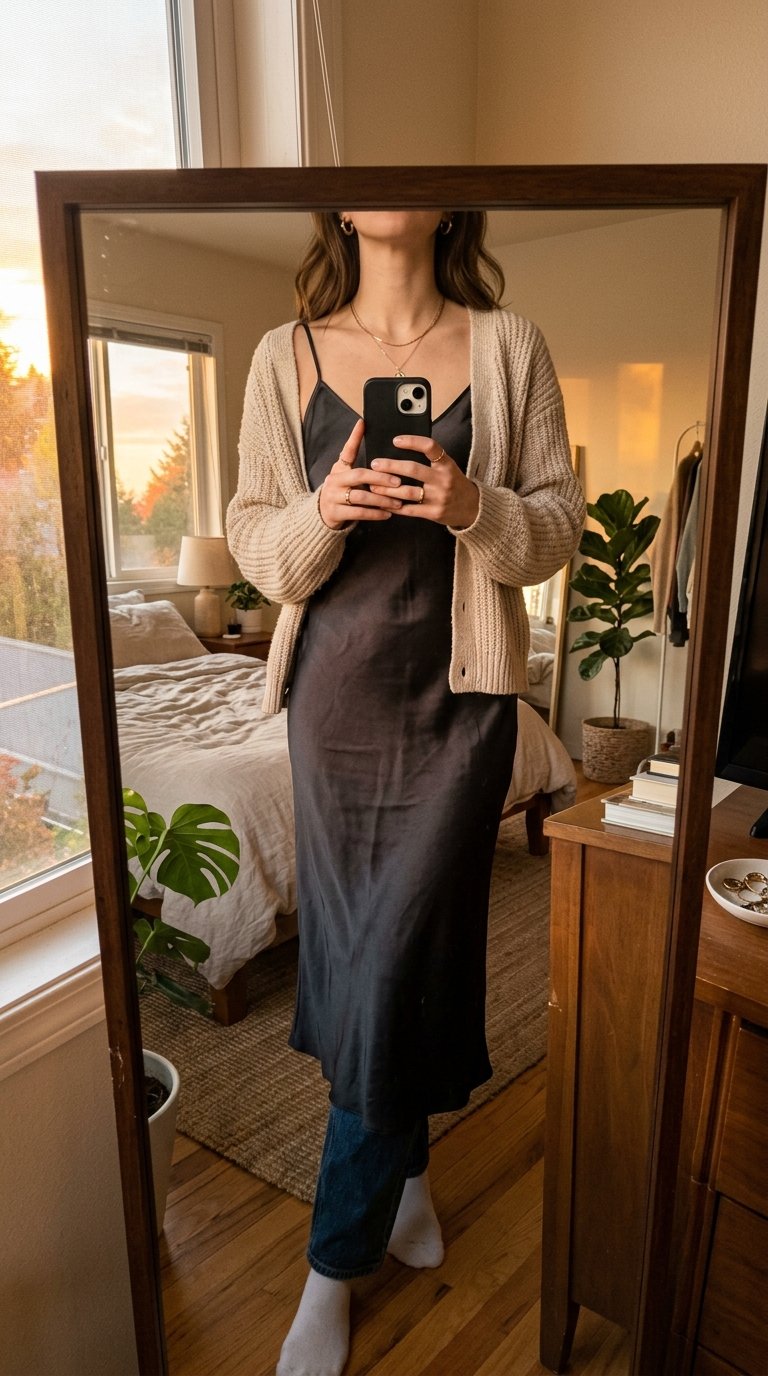 There’s something undeniably magnetic about mixing vastly different textures in a single outfit. Pairing a soft, cozy sweater with a sleek, liquid-like silk dress creates an incredible visual contrast. It’s the perfect balance of relaxed comfort and elevated evening glamour.