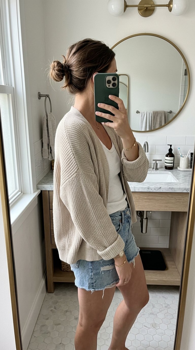 Make sure your denim shorts have a slightly relaxed fit around the thighs. Skin-tight denim paired with a bulky top can sometimes look a bit unbalanced. A slightly looser vintage fit perfectly complements the slouchy, laid-back energy of the cardigan.