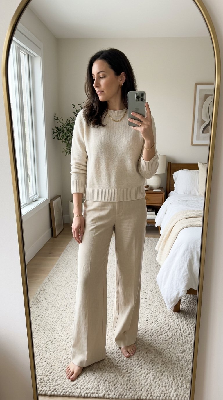 When you’re dressing in a single color palette, mixing your textures becomes absolutely crucial. The vertical lines of a ribbed knit top contrast beautifully against the smooth, flat finish of the tailored trousers. This subtle difference in fabric prevents the matching colors from looking flat or boring.