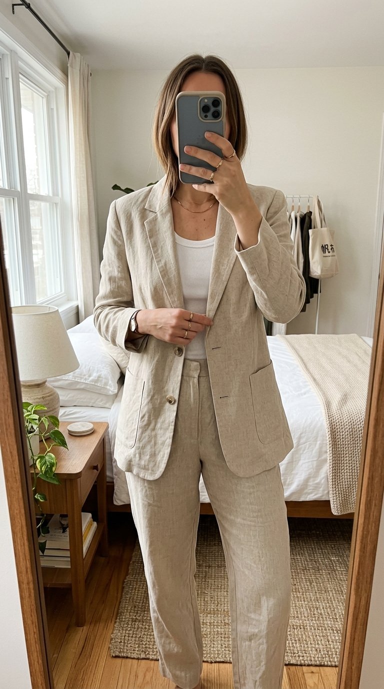 It gives you all the structured authority of a traditional power suit, but the breathable fabric ensures you will not melt on your morning train ride. Plus, there is something incredibly chic and effortless about the slight, natural rumple of high-quality linen.