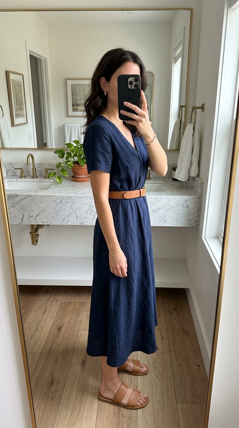 The magic of this outfit lies entirely in the waist-cinching power of the woven tan leather belt. A lot of summer dresses can look a bit shapeless, but swapping out the flimsy fabric tie for a real leather belt instantly makes the dress look expensive and tailored.