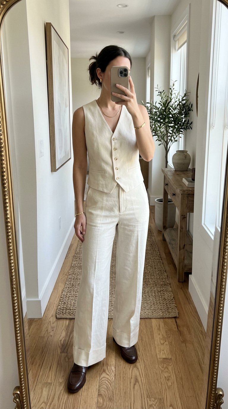 Tuck your white silk camisole completely into your trousers to define your waistline. The contrast between the matte, textured linen and the smooth, glossy silk creates a beautiful visual dynamic that elevates the entire look.