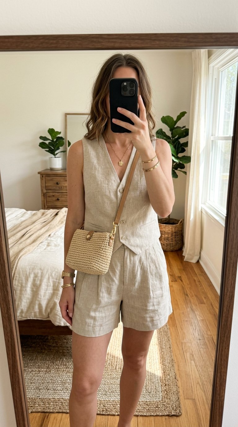 • Matching blazer and tailored shorts in a soft pastel or neutral tone