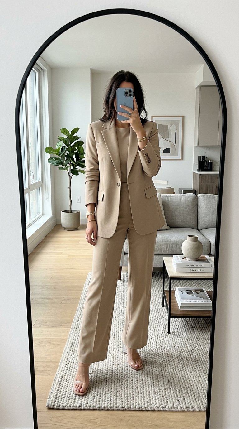 Since the clothing is very soft and neutral, you can afford to carry a slightly bolder, structured handbag. A rich caramel or deep tan leather tote adds just the right amount of warmth and professionalism. Seriously, this combination will make you feel like you can conquer the world.