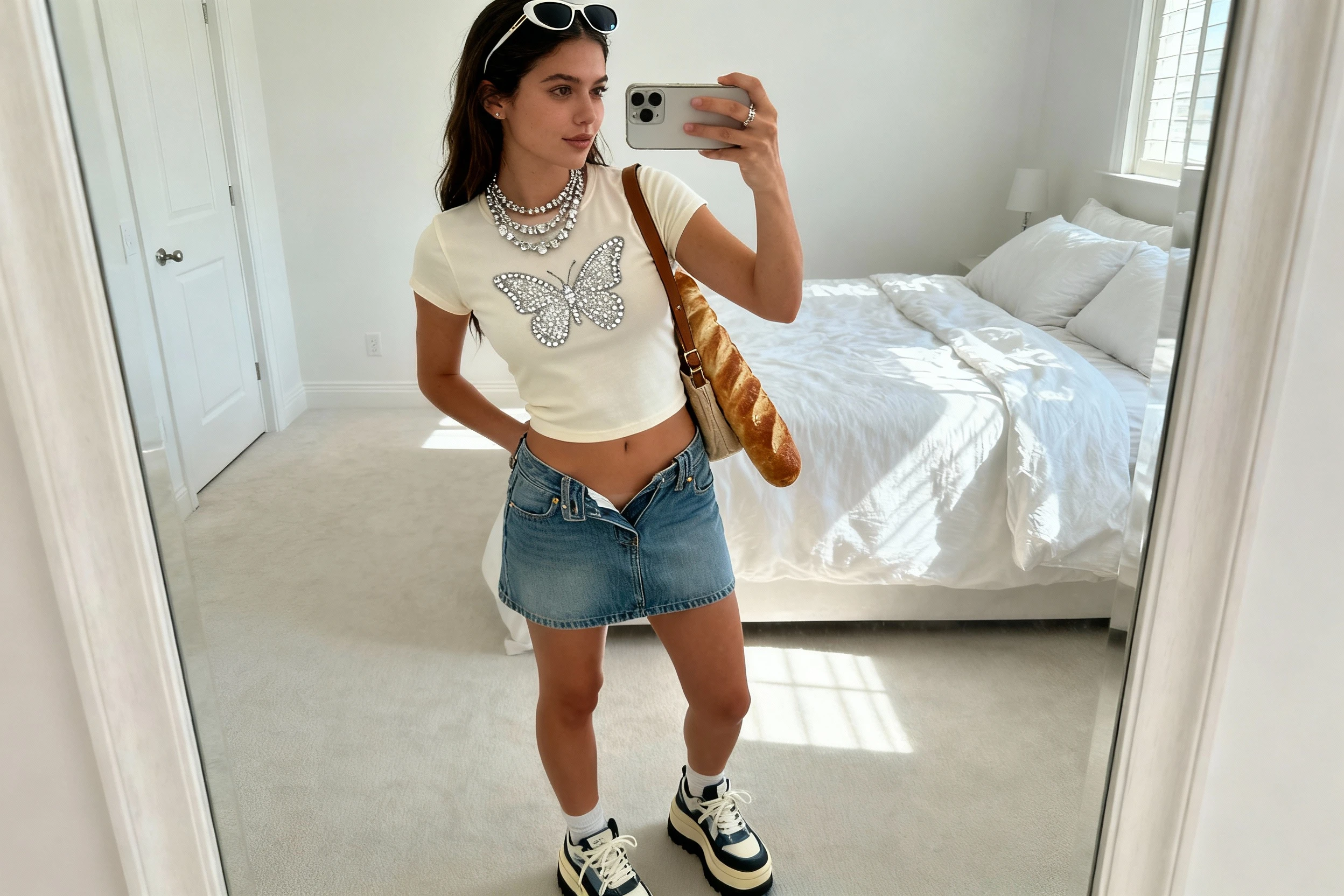 This is the quintessential Y2K look: flirty, slightly sporty, and dripping with shiny details. It’s perfect for concerts, casual nights out, or when you want that playful, “I just stepped out of TRL” energy. The magic is in the mix—denim, baby tees, rhinestones, and a little attitude.